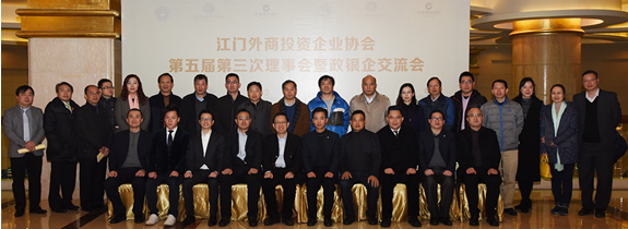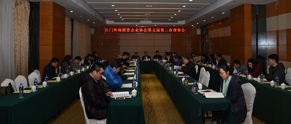 2018年2月2日协会在江门市名冠金凯悦大酒店召开了第五届第三次理事会。协会冯广源会长、市商务局赵瑞思局长以及协会副会长、常务理事、理事共45人出席了会议。