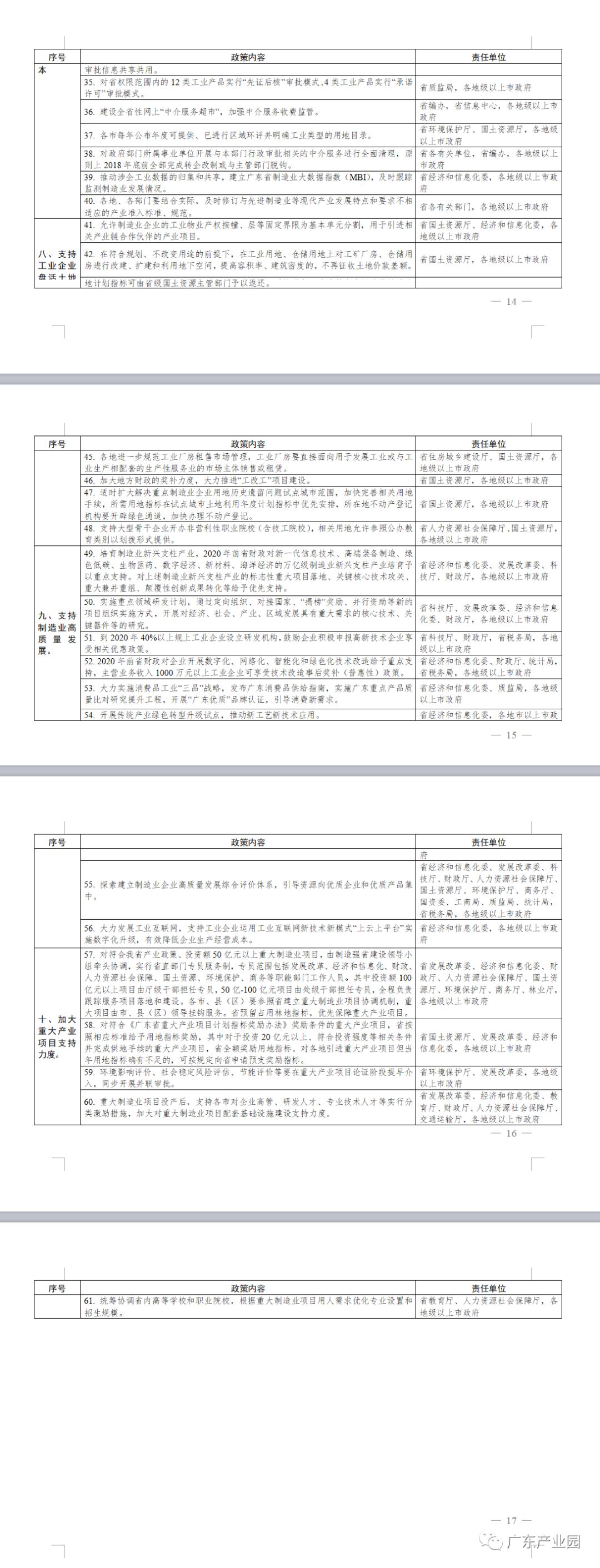十、加大重大产业项目支持力度。对符合我省产业政策、投资额50亿元以上重大制造业项目,由制造强省建设领导小组牵头协调,实行省直部门专员服务制,专员范围包括发展改革、经济和信息化、财政、人力资源社会保障、国土资源、环境保护、商务等职能部门工作人员。其中投资额100亿元以上项目由厅级干部担任专员,50亿-100亿元项目由处级干部担任专员,全程负责跟踪服务项目落地和建设。各市、县(区)要参照省建立重大制造业项目协调机制,重大项目由市、县(区)领导挂钩服务。省预留占用林地指标,优先保障重大产业项目。对符合《广东省重大产业项目计划指标奖励办法》奖励条件的重大产业项目,省按照相应标准给予用地指标奖励,其中对于投资20亿元以上、符合投资强度等相关条件并完成供地手续的重大产业项目,省全额奖励用地指标。对各地引进重大产业项目但当年用地指标确有不足的,可按规定向省申请预支奖励指标。环境影响评价、社会稳定风险评估、节能评价等要在重大产业项目论证阶段提早介入,同步开展并联审批。重大制造业项目投产后,支持各市对企业高管、研发人才、专业技术人才等实行分类激励措施,加大对重大制造业项目配套基础设施建设支持力度。统筹协调省内高等学校和职业院校,根据重大制造业项目用人需求优化专业设置和招生规模。