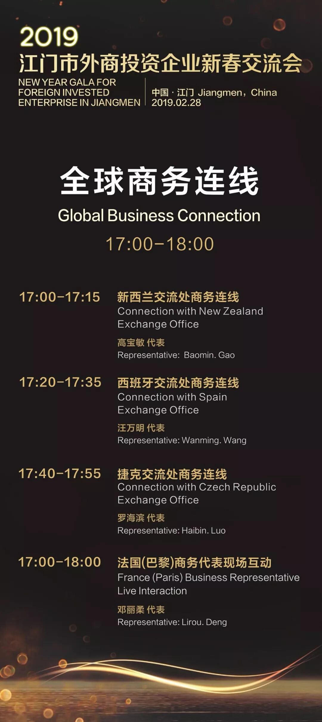 1、全球商务连线:本次活动与江门市19个境外商务交流处紧密合作,推出现场全球商务连线环节,与新西兰、西班牙、捷克商务代表现场互动,更有法国(巴黎)商务代表亲到现场,为各企业推介境外合作商机,助力企业开拓境外业务。