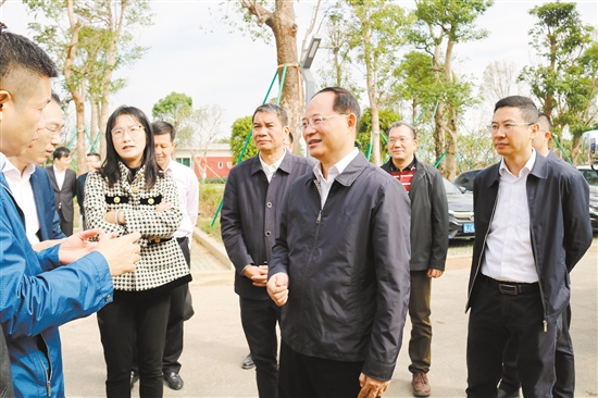 市委书记、市人大常委会主任林应武在江门人才岛智慧城市展示中心建设现场调研。 江门日报记者 肖开刚 摄
