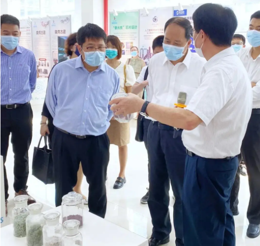 陈选尧(左一)、陈岸明(左二)查看废物处理公司展出的样品