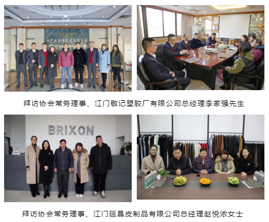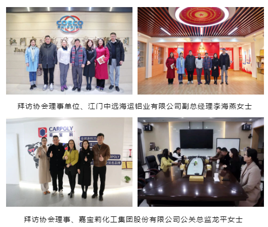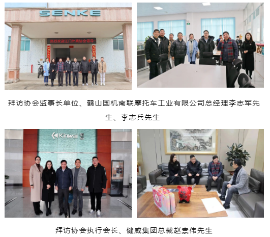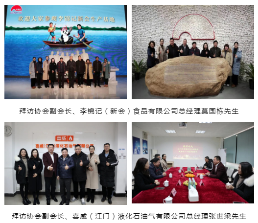 本次新春拜访的企业分别有:鹤山国机南联摩托车工业有限公司、健威集团、永富容器(江门)有限公司、江门高力金属制品有限公司、李锦记(新会)食品有限公司、喜威(江门)液化石油气有限公司、江门大昌慎昌食品加工仓储有限公司、江门延昌皮制品有限公司、江门市丽明珠箱包皮具有限公司、江门敬记塑胶厂有限公司、嘉宝莉化工集团股份有限公司、江门中远海运铝业有限公司、江门市华创电机有限公司。